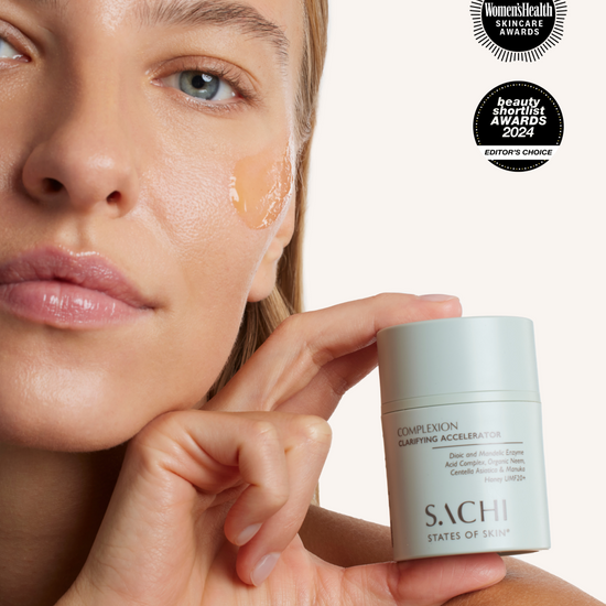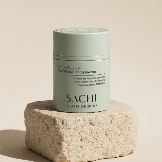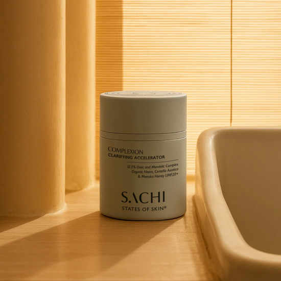 The Complexion Clarifying Accelerator uses a gentle yet advanced Enzyme Acid Complex, a 5-in-1 serum to resurface, retexturise, clarify and brighten your skin. This unique formula combines Clarifying Ayurvedic botanicals like Organic Neem and Thyme, working together to reveal clearer, more radiant skin over time.
