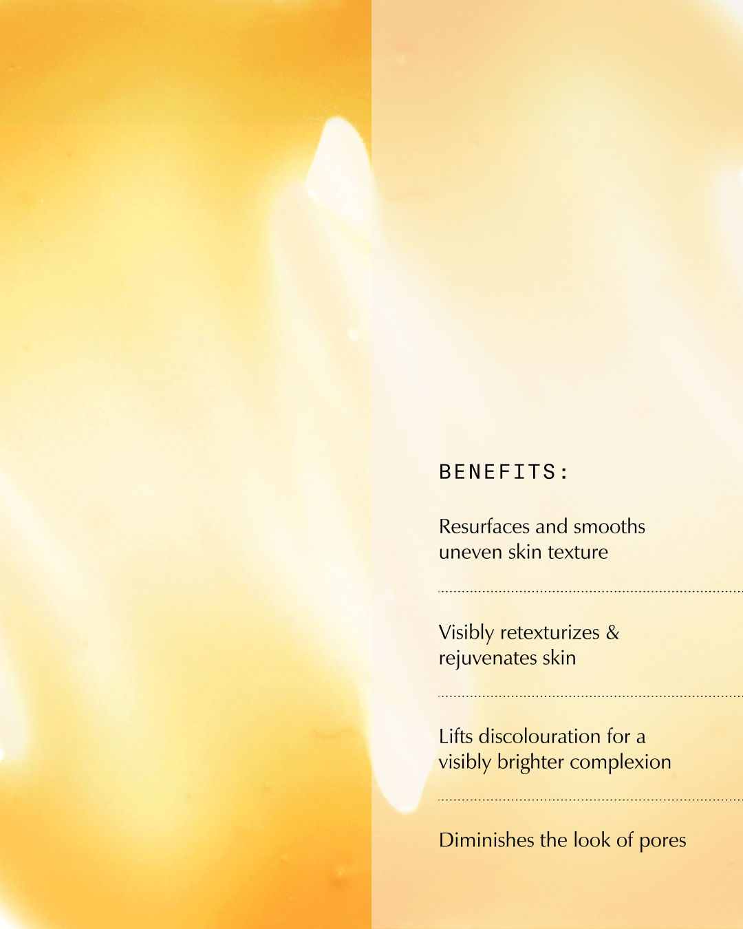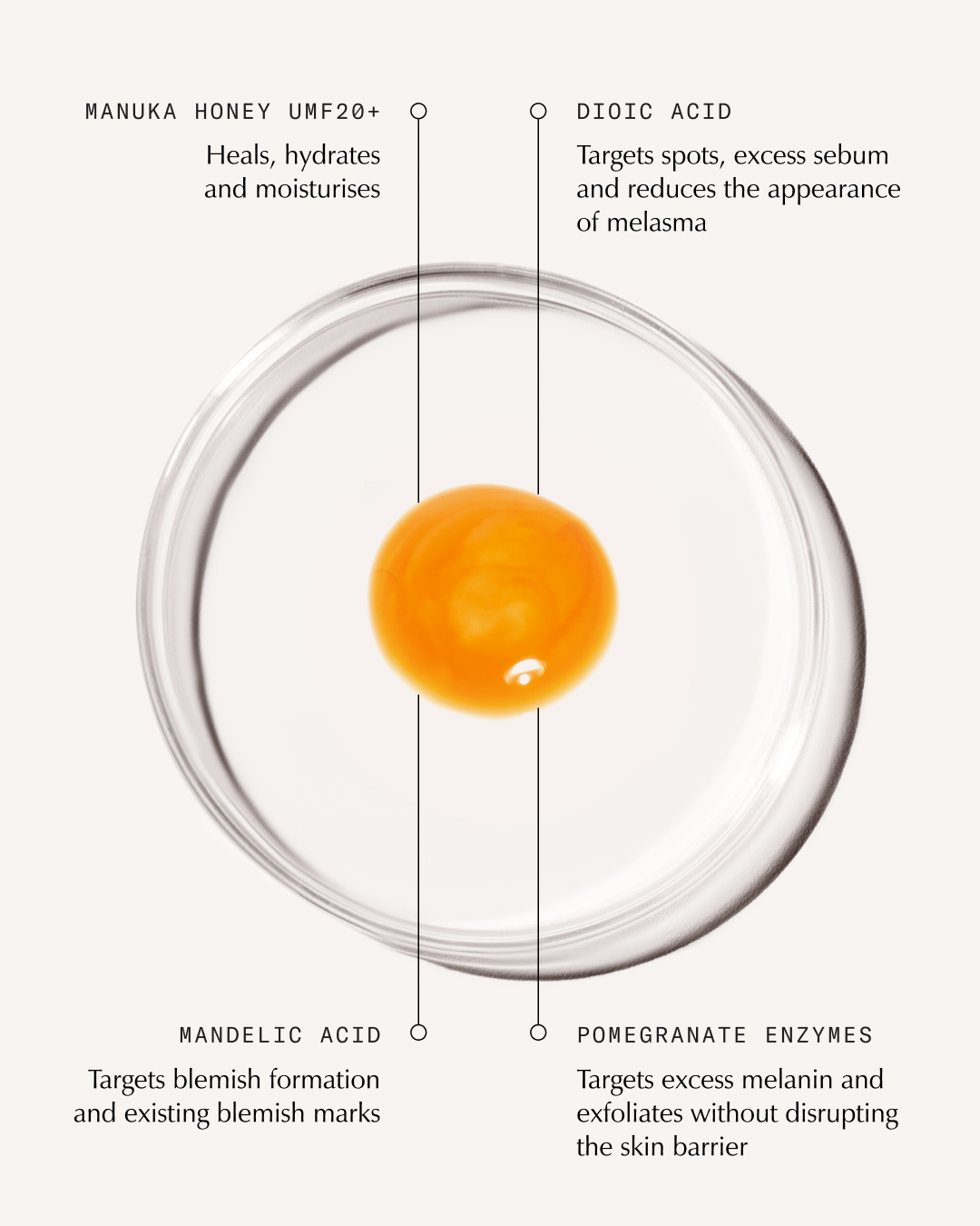 Formulated with Dioic Acid, Mandelic Acid & Pomegranate Enzymes, this powerhouse blend helps retexturize and resurface the skin, helping smoothen fine lines and wrinkles, stimulate renewal, refine pores and lift stubborn discolourations.