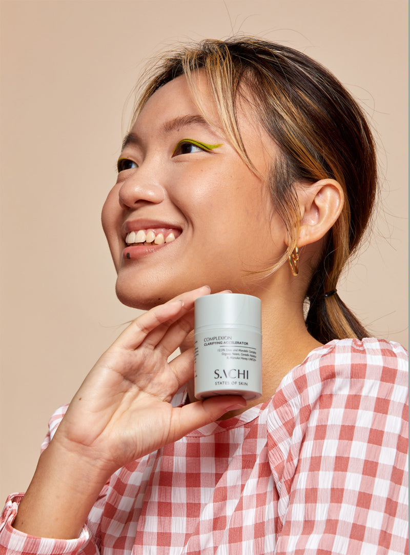 For Retinoid beginners, avoid exfoliating for 2-3 weeks prior to use and use once a week before building up frequency of use and allow your skin to acclimate before adding any other skin stimulating ingredients. Afterward, or for Retinoid intermediates, you can alternate the products, using the CCA twice a week and the UAR 1-3 times a week. Lastly, for experienced Retinoid users, you can layer, still taking care to use the Complexion Clarifying Accelerator only about twice a week as an overnight treatment. See Sachi Papers Retinoid Series for more guidance.