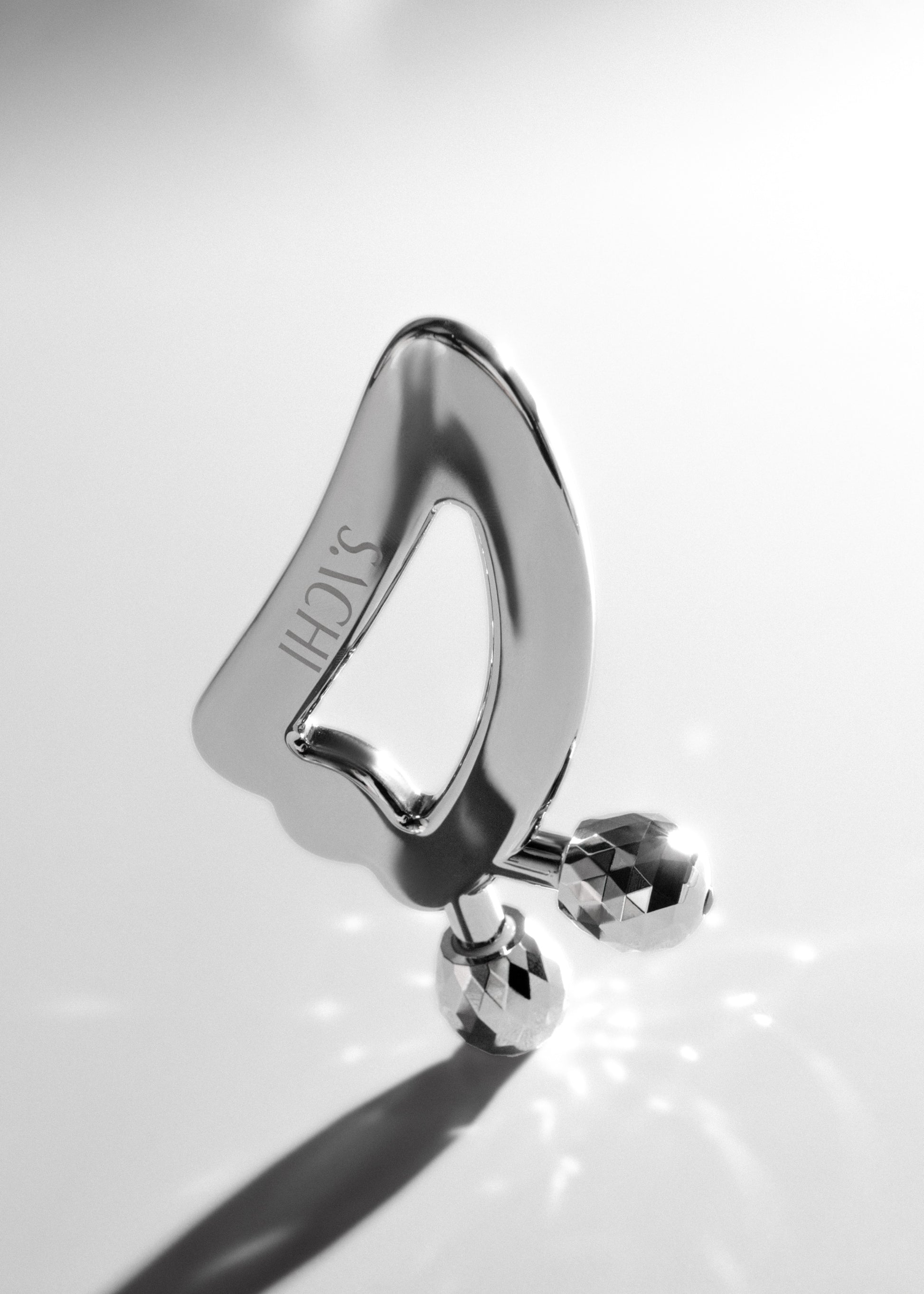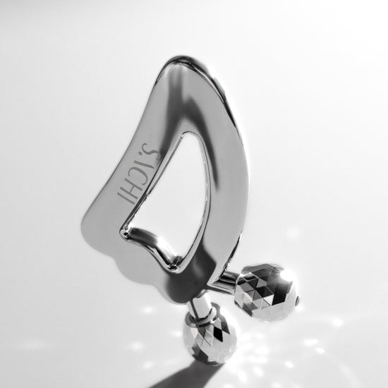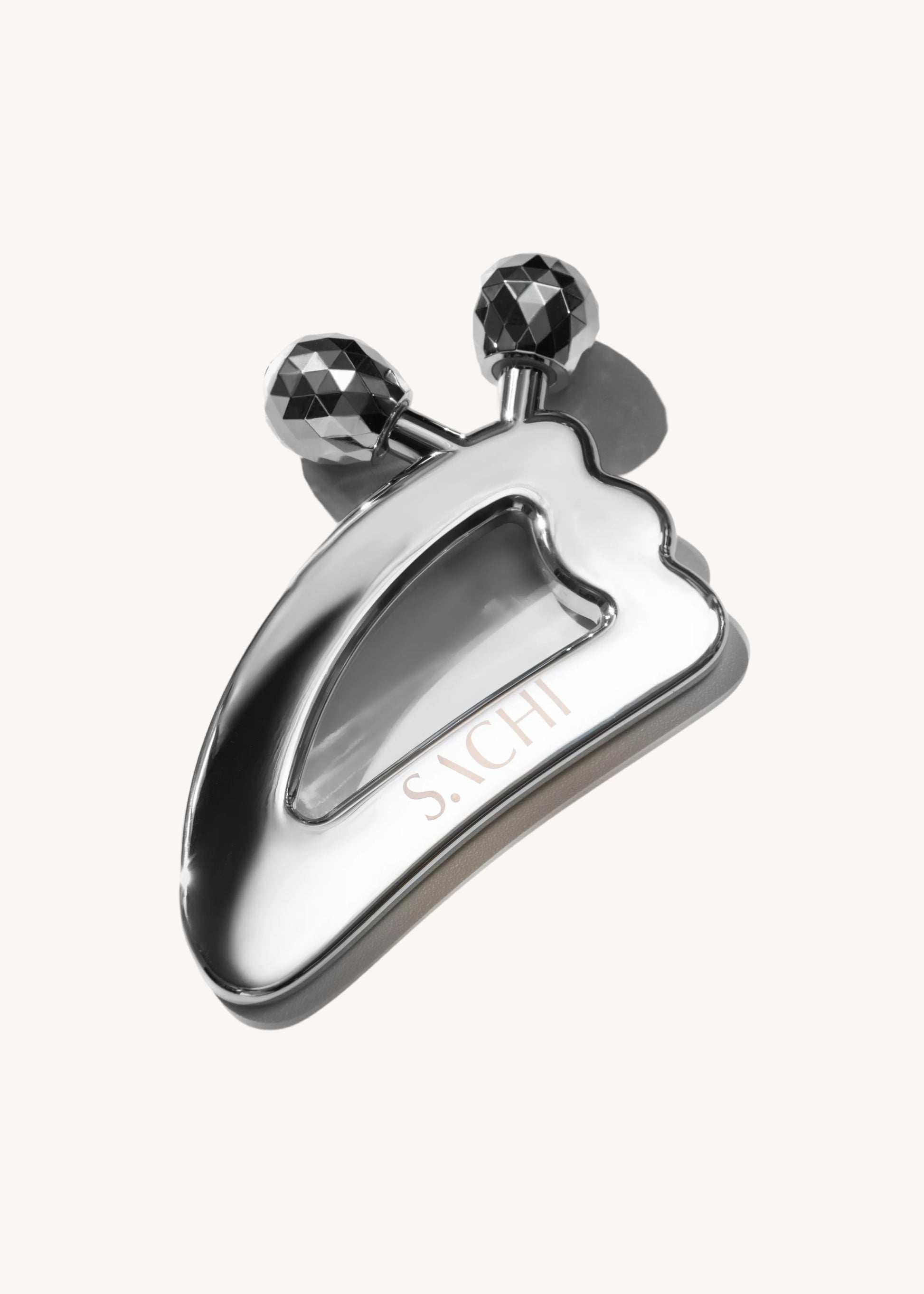 Titanium alloy in a silver finish with a contoured gua sha edge and twin rolling massage balls. An ergonomic handle provides precise control; faceted rollers deliver multi-angle stimulation; smooth, polished edges glide gently on skin. Naturally cool, durable, and easy to clean. Size: 7.4 × 11.9 cm.