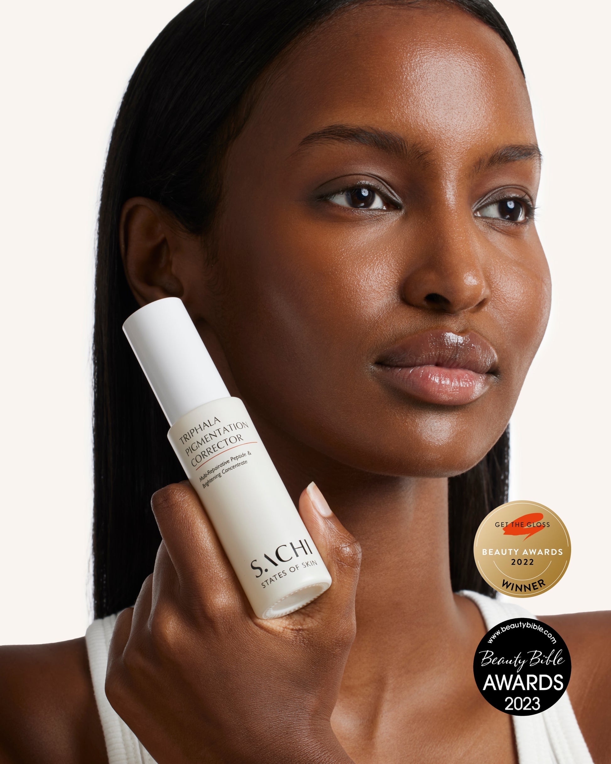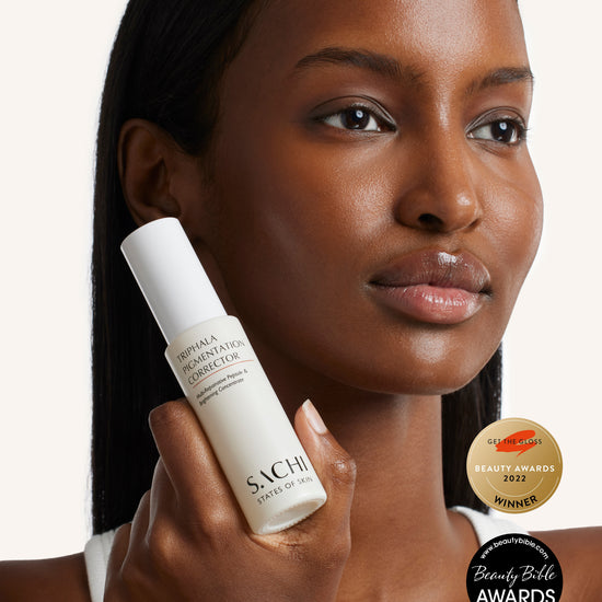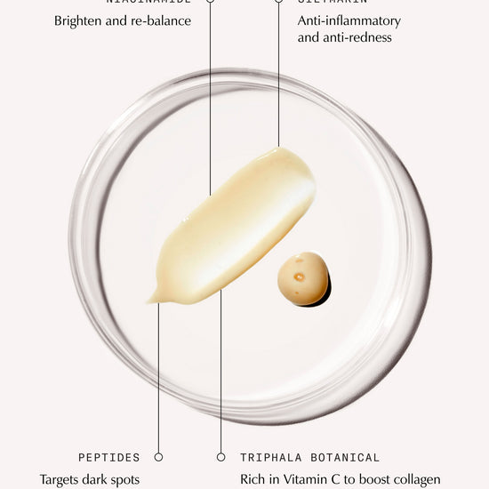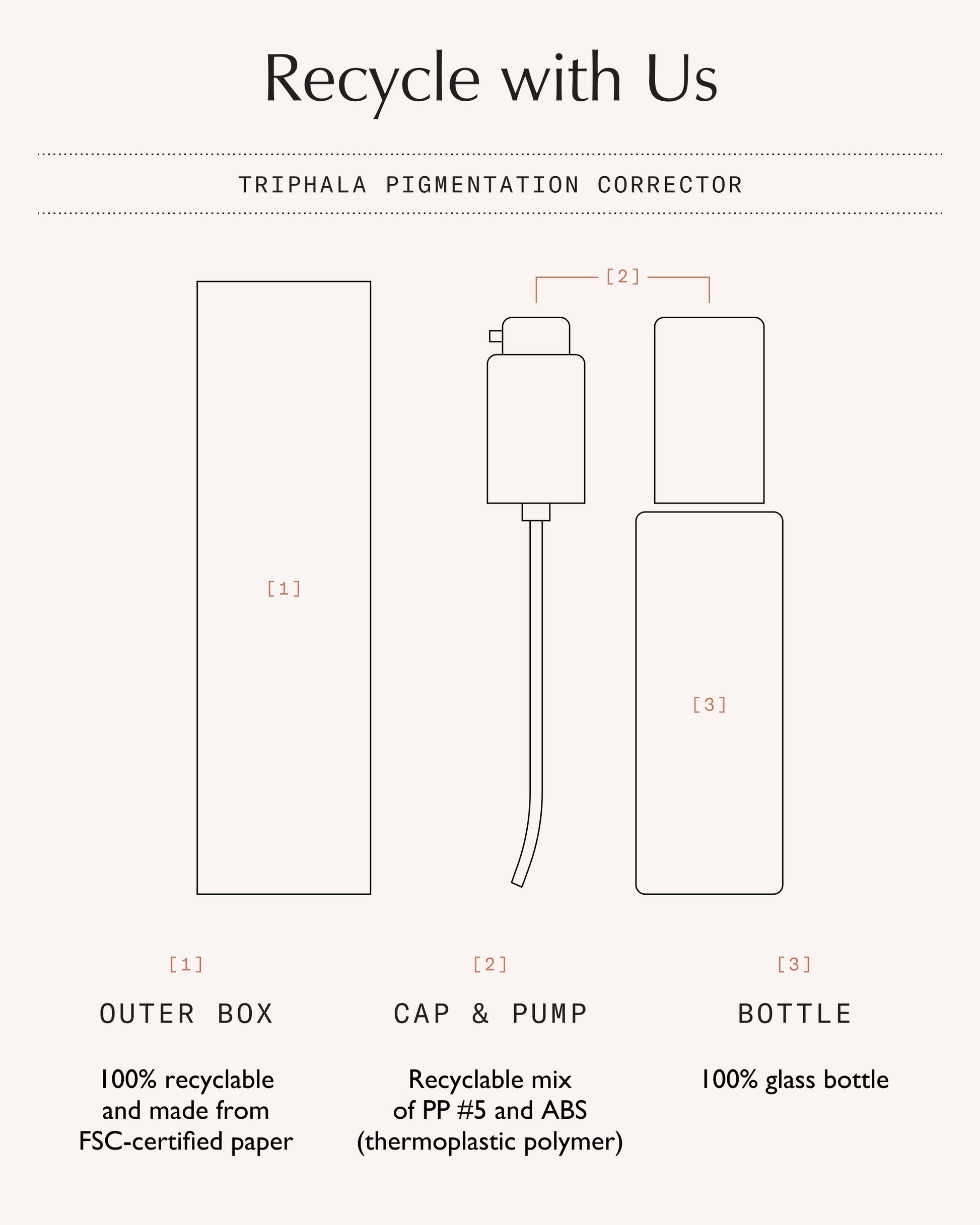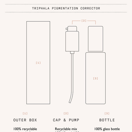 Composed of three Ayurvedic superfruits, Triphala works to diminish the appearance of hyperpigmentation, sun damage, fade dark spots, and improve yellowish skin whilst preventing the breakdown of Hyaluronic Acid in the skin, promoting a visible and lasting glow. Amlahown to have high levels of antioxidant activity via Vitamin C, Tannins, Polyphenols, Ellagic Acid, Amla regulates melanin production in the skin, reducing and preventing age spots.